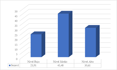 En el gráfico se observa el resultado de la evaluación de impacto de la gestión, donde el 45.48% de los encuestados orientaron sus respuestas hacia el nivel medio, es decir, el programa Juntos medianamente evalúa su gestión utilizando encuestas y además, ha dado a conocer en la comunidad del distrito de San Martín de Pangoa, información sobre los beneficios que ustedes reciben. Mientras que 30.61% posicionó sus respuestas al nivel alto y el otro 23.91% restante hacia el nivel bajo. Estos resultados manifiestan que el programa Juntos forja moderadamente actividades en la comunidad para aminorar las necesidades económicas de estos.
