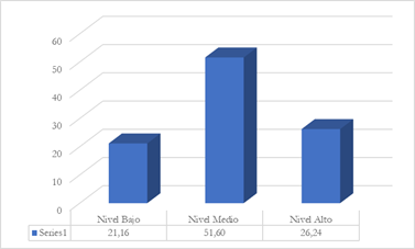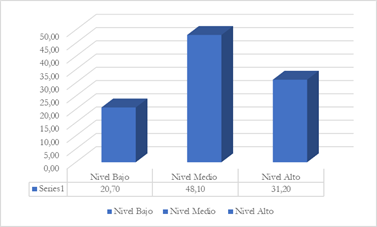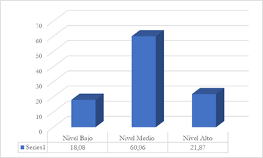 En el gráfico se observan los resultados del nivel de la dimensión bienestar emocional, donde se tiene que, el 60.35% de las respuestas obtenidas se orientaron hacia el nivel medio, esto quiere decir que, medianamente los representantes del programa juntos realizan la visita a los hogares beneficiados para crean un diálogo mediante reuniones regulares y también estas personas cuando visitan a la comunidad moderadamente prestan atención a lo que ellos plantean. Así mismo, se conoció que el 21.28% de los encuestados situaron sus respuestas en el nivel alto y el otro 18.37% en el nivel bajo. En otras palabras, los hallazgos muestran que, medianamente los representantes del programa Juntos reconocen las experiencias y valoran la identidad y cultura de los beneficiados de la comunidad del distrito de San Martín de Pangoa, Satipo, región Junín.