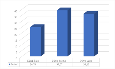 En el gráfico se muestran los hallazgos en el nivel de la dimensión bienestar físico, donde se logró un nivel medio en las respuestas obtenidas por los encuestados, esto con el 39.07%, considerando así que, en la comunidad de San Martín de Pangoa los habitantes tienen un nivel medio de problemas para poder tener alimentos en sus hogares, de igual manera, estos hallazgos dicen que, el programa Juntos ha promovido moderadamente el acceso a la vivienda para todas las personas en más vulnerables de la comunidad en estudio. Así mismo, se conoció que el 36.15% de las repuestas apuntaron al nivel alto y el otro 24.78% hacia el nivel bajo. Esto demuestra entonces, que el programa Juntos ha ayudado medianamente a las familias del distrito de San Martín de Pangoa, Satipo, región Junín a obtener viviendas seguras y saludables y que muy poco ha proporcionado en los hogares un entorno adecuado y libre de riesgos para sus habitantes.